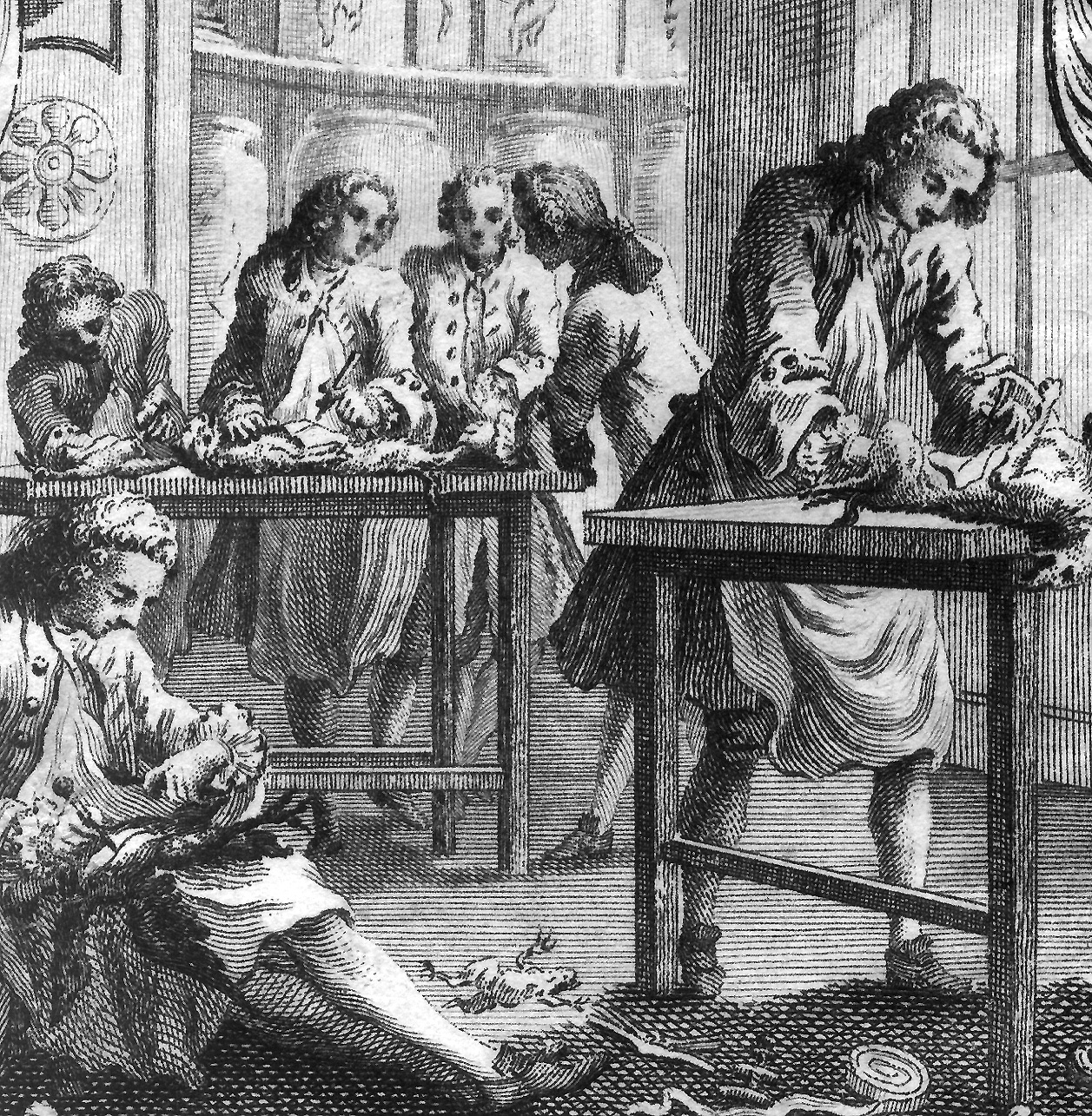 Junge Mediziner bei ihren Tierversuchen in einem Seziersaal.